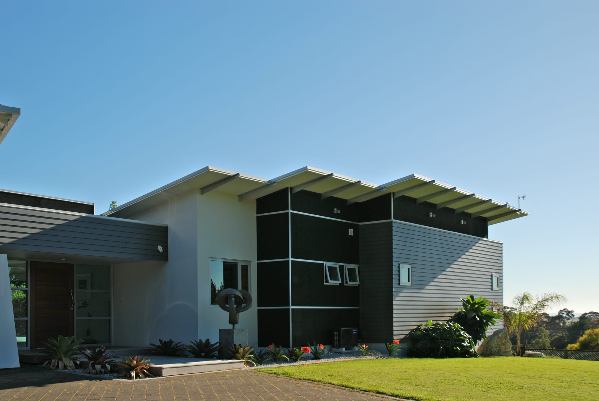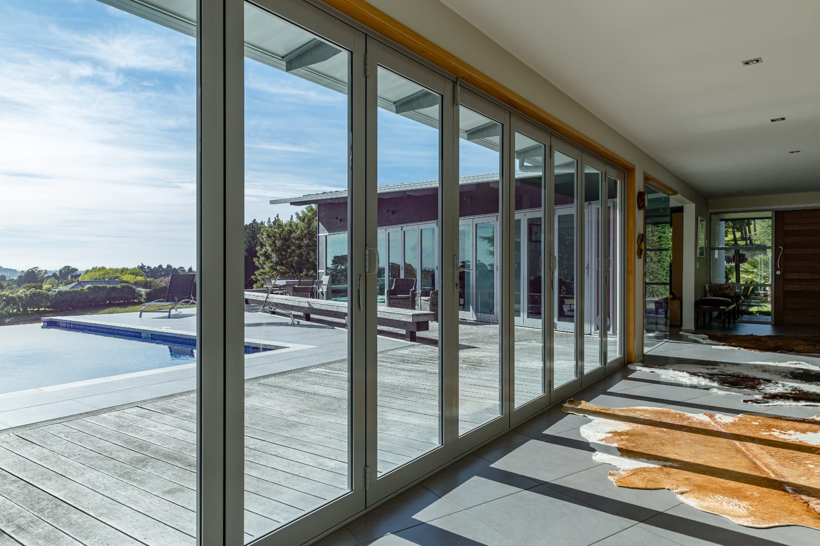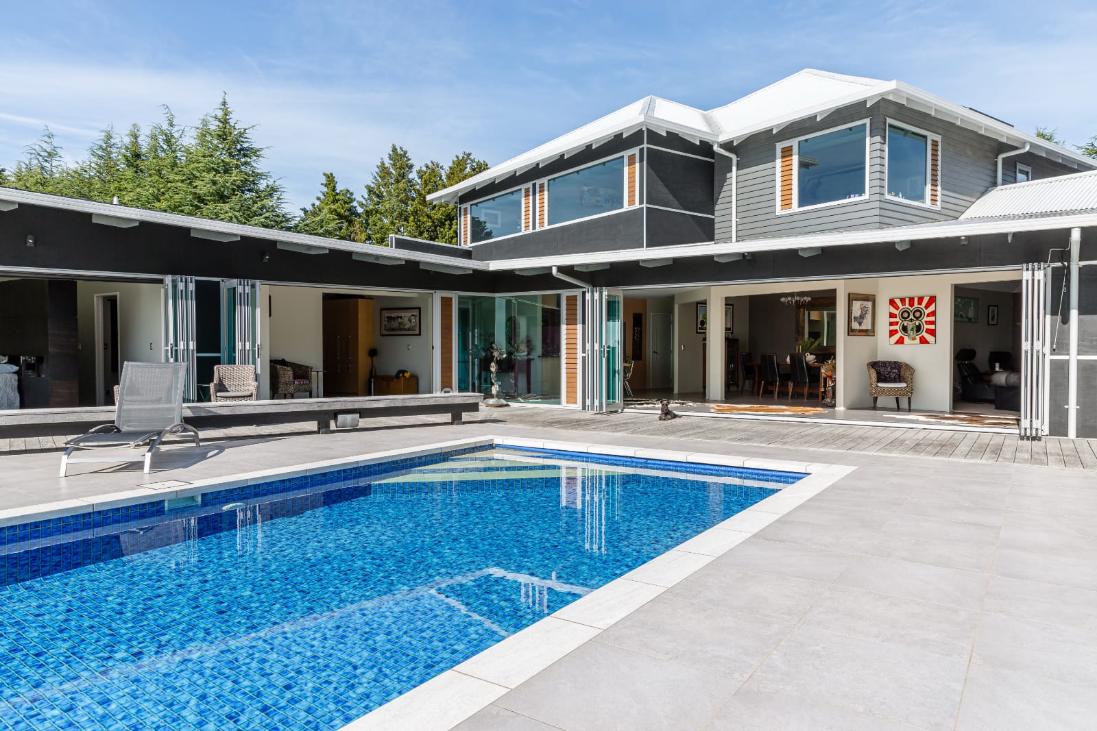 Interior planning emphasizes the indoor-outdoor style of living, totally suited to the location in Hawke’s Bay-the key planning element was the informal gallery area unifying the main formal spaces with the main entry and outdoor spaces.